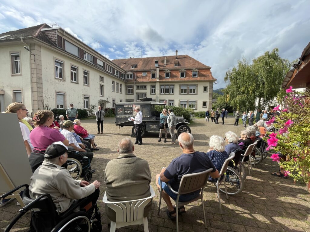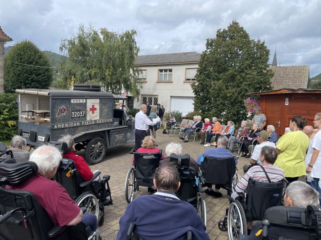 Les résidents et les équipes de l’EHPAD ont eu la chance d’assister à une présentation historique et découvrir ce véhicule unique, témoin concret du rôle de l’hôpital de Moosch pendant la guerre. Très touchés par cette rencontre, ils ont exprimé leur gratitude à la délégation pour le temps et les souvenirs partagés.