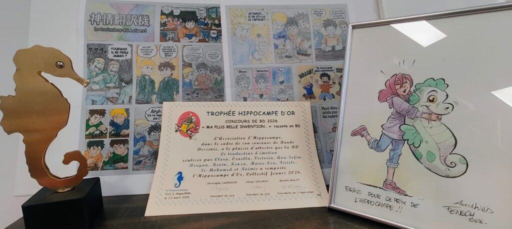 Cette année, les élèves de l’atelier multisupport de l’Institut Saint Joseph de Guebwiller, ont relevé le défi en proposant une bande dessinée originale autour d’une belle invention : « Le Traducteur d’Emotions”, que vous pouvez découvrir en vidéo ci-dessous. Leur travail a été récompensé par le premier prix, l’Hippocampe d’or, dans la catégorie « collectif jeune ».