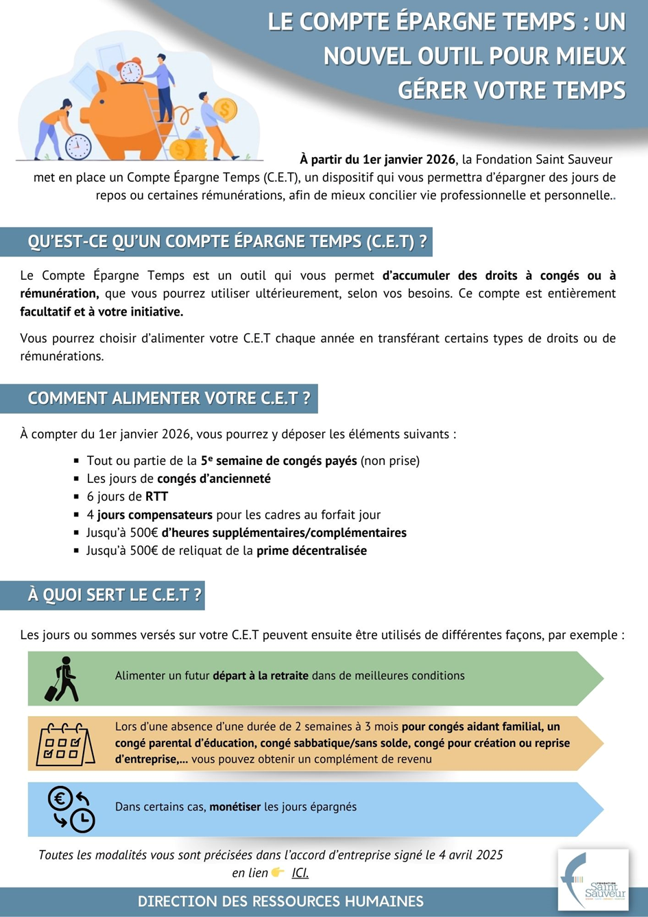 💡 Le mot de la fin : Tous ces documents et dispositifs sont là pour vous aider à comprendre vos droits, organiser votre vie professionnelle et profiter pleinement des avantages de la Fondation. Certains points peuvent sembler complexes… alors n’hésitez pas à solliciter votre référent RH pour être guidé !